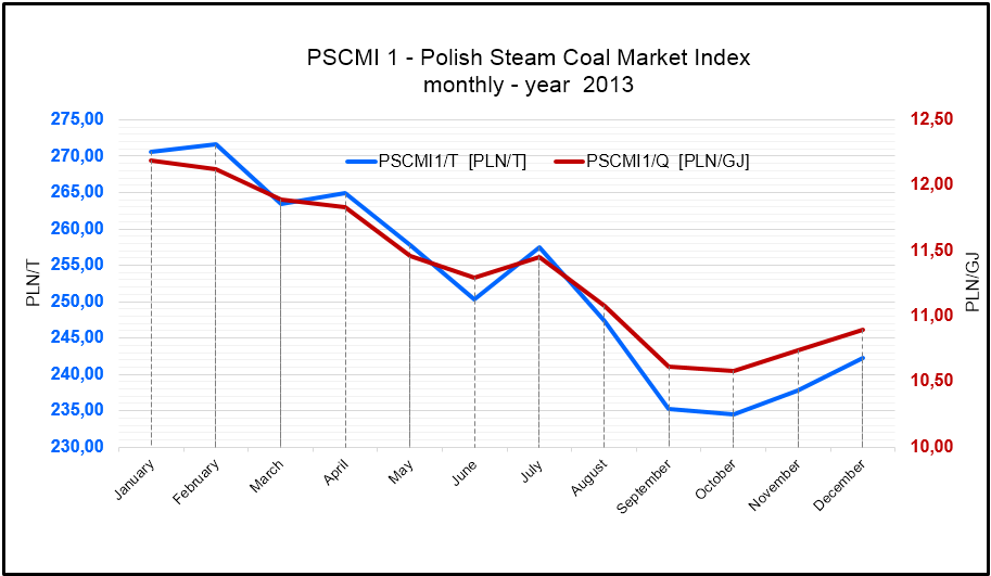 PSCMI 1 index (PSCMI 1/T in PLN/tonne and PSCMI 1/Q in PLN/GJ): reflects the price of steam coal fines (class 20-23/1) in sales to electricity producers (public power plants and industrial power plants). Calculated as a weighted average of monthly deliveries, meeting following specified coal quality standard: calorific value equal or greater than 20 MJ/kg and less than 24 MJ/kg on a net-as-received basis, with maximum sulfur content of 1% as received. Price of monthly product is determined as a weighted average of transactions on the Polish steam coal market, completed (invoiced) in a given calendar month. The base price is a price ex mine, this is a net price without: excise tax, VAT, cost of insurance and delivery cost, under the CFA conditions with the point of loading  "on the wagon".