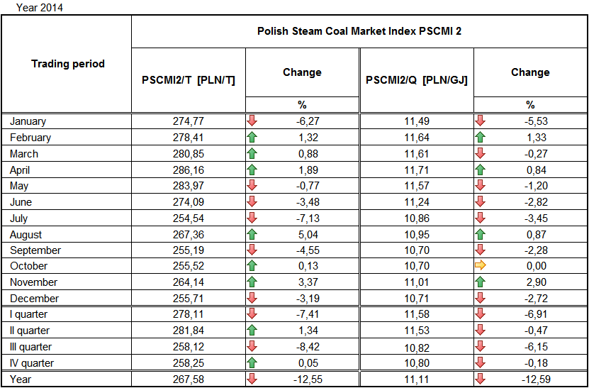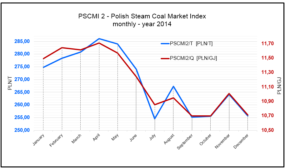 PSCMI2 index (PSCMI 2/T in PLN/tonne and PSCMI 2/Q PLN/GJ) reflects the price level of steam coal fines (class 23-26/08) in sales to industrial and municipal heating plants, other industrial users and other domestic customers. Calculated as a weighted average of monthly deliveries, meeting specified coal quality standard: calorific value equal or greater than 23 MJ/kg and less than 27 MJ/kg on a net-as-received basis, with maximum sulfur content of 0.8% as received. Price of monthly product is determined as a weighted average of transactions on the Polish steam coal market, completed (invoiced) in a given calendar month. The base price is a price ex mine, this is a net price without: excise tax, VAT, cost of insurance and delivery cost, under the CFA conditions with the point of loading "on the wagon".